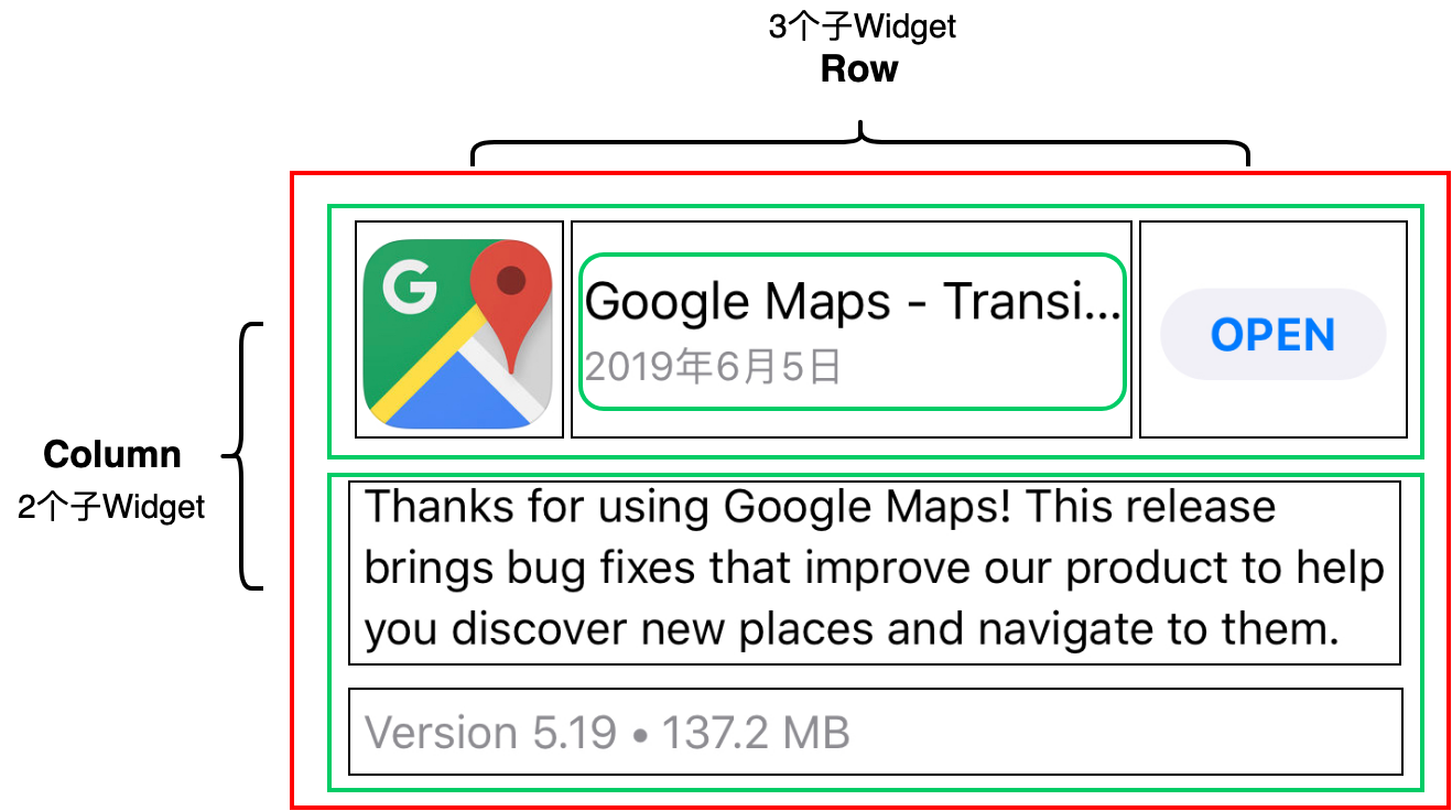 按垂直方向,我们用绿色的框把这个UI拆解为上半部分与下半部分,如图2所示。下半部分比较简单,是两个文本控件的组合;上半部分稍微复杂一点,我们先将其包装为一个水平布局的Row控件。