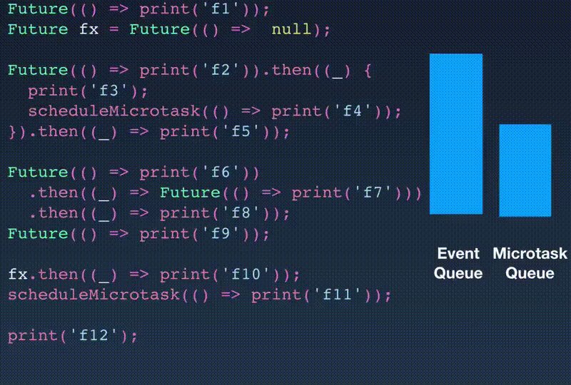 上面的代码很是烧脑,万幸我们平时开发Flutter时一般不会遇到这样奇葩的写法,所以你大可放心。你只需要记住一点:then会在Future函数体执行完毕后立刻执行,无论是共用同一个事件循环还是进入下一个微任务。