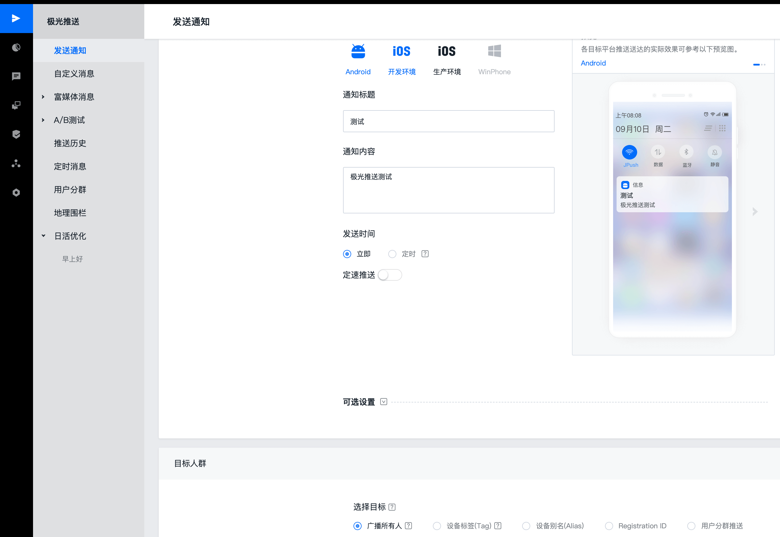 在发送通知一栏,我们把通知标题改为“测试”,通知内容设置为“极光推送测试”;在目标人群一栏,由于是测试账号,我们可以直接选择“广播所有人”,如果你希望精确定位到接收方,也可以提供在应用中获取到的极光推送地址(即Registration ID):