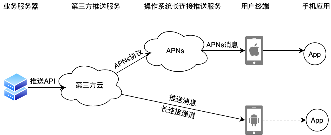 在iOS上,苹果推送服务(APNs)接管了系统所有应用的消息通知需求;而Android原生,则提供了类似Firebase的云消息传递机制(FCM),可以实现统一的推送托管服务。