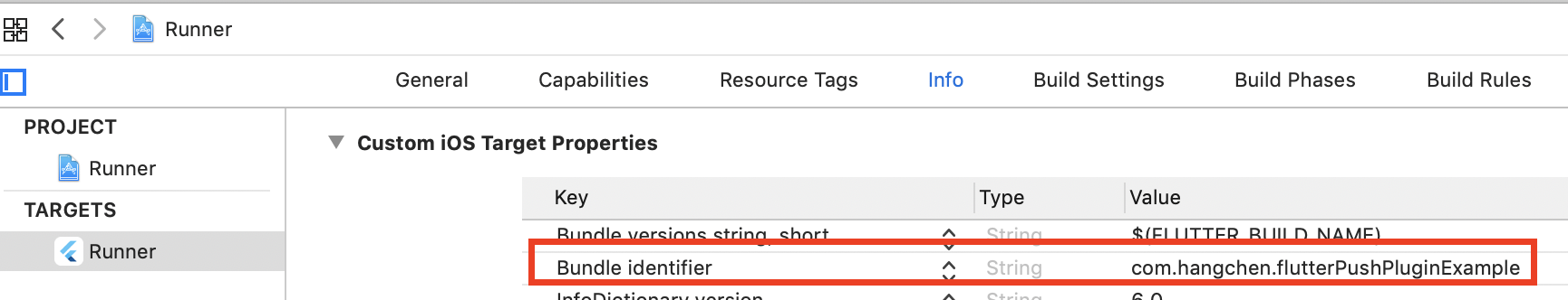 最后,在Info tab下的Bundle identifier项,把我们刚刚在极光官网注册的Bundle ID显式地更新进去: