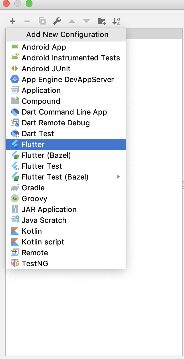 然后,点击位于工具栏面板左侧顶部的“+”按钮,在弹出的菜单中选择Flutter选项,为应用程序新增一项启动入口: