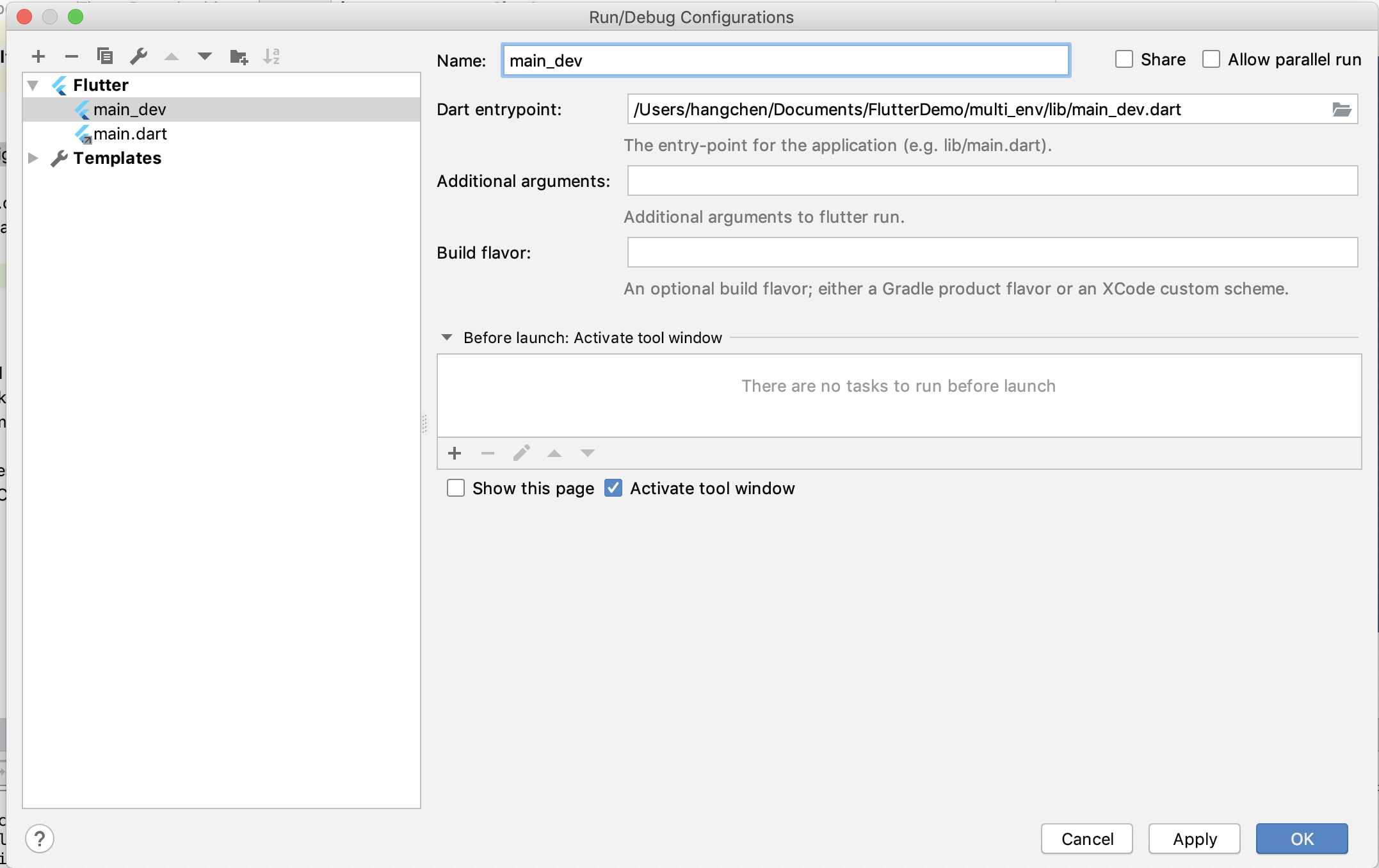 如果我们想在Android Studio上为应用程序创建不同的启动配置,则可以通过Flutter插件为main_dev.dart增加启动入口。