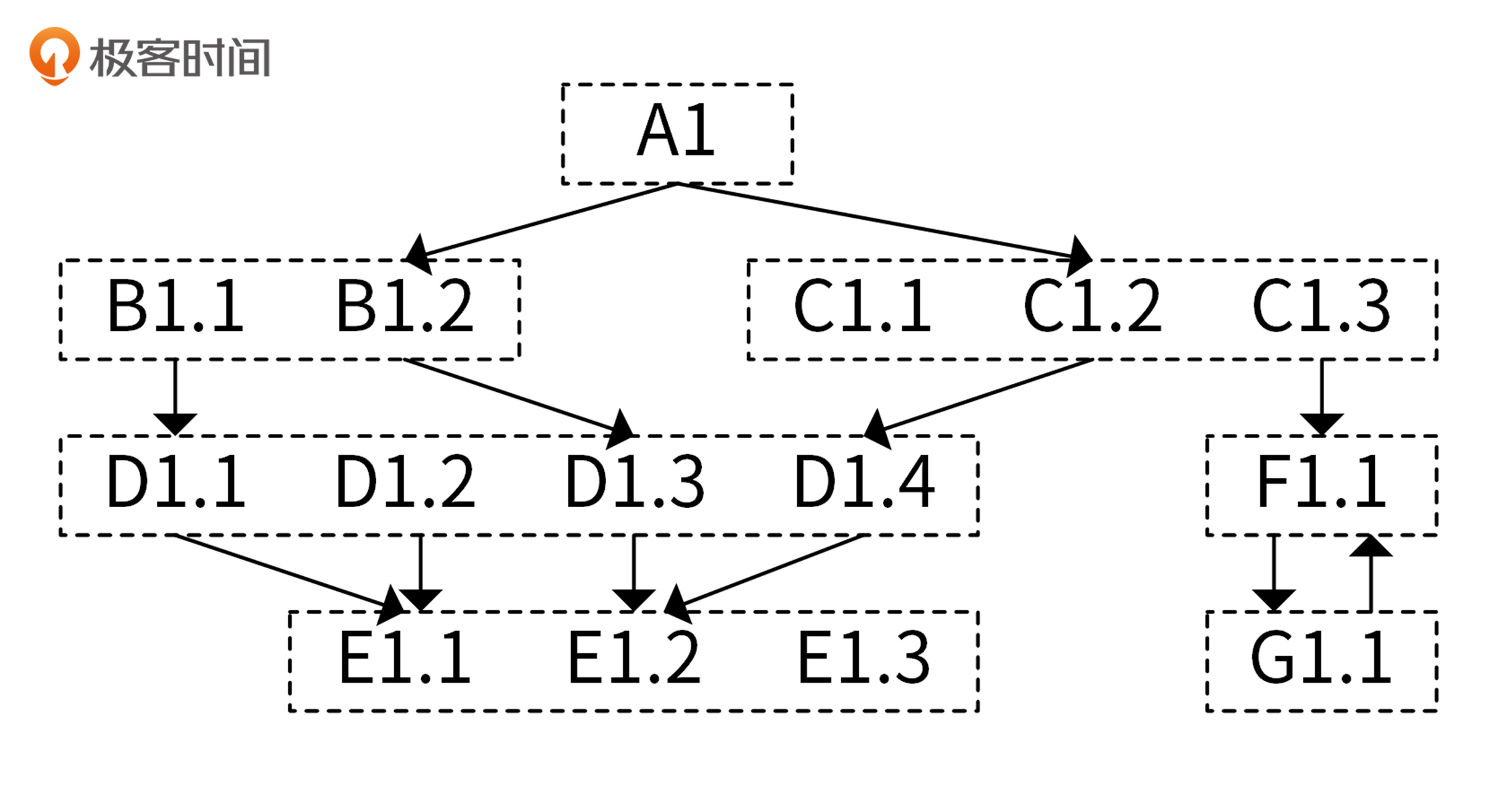 在上述依赖中,模块A依赖了模块B和模块C,模块B依赖了模块D,模块C依赖了模块D和模块F,模块D又依赖了模块E。并且,同模块的不同版本还依赖了对应模块的不同版本。