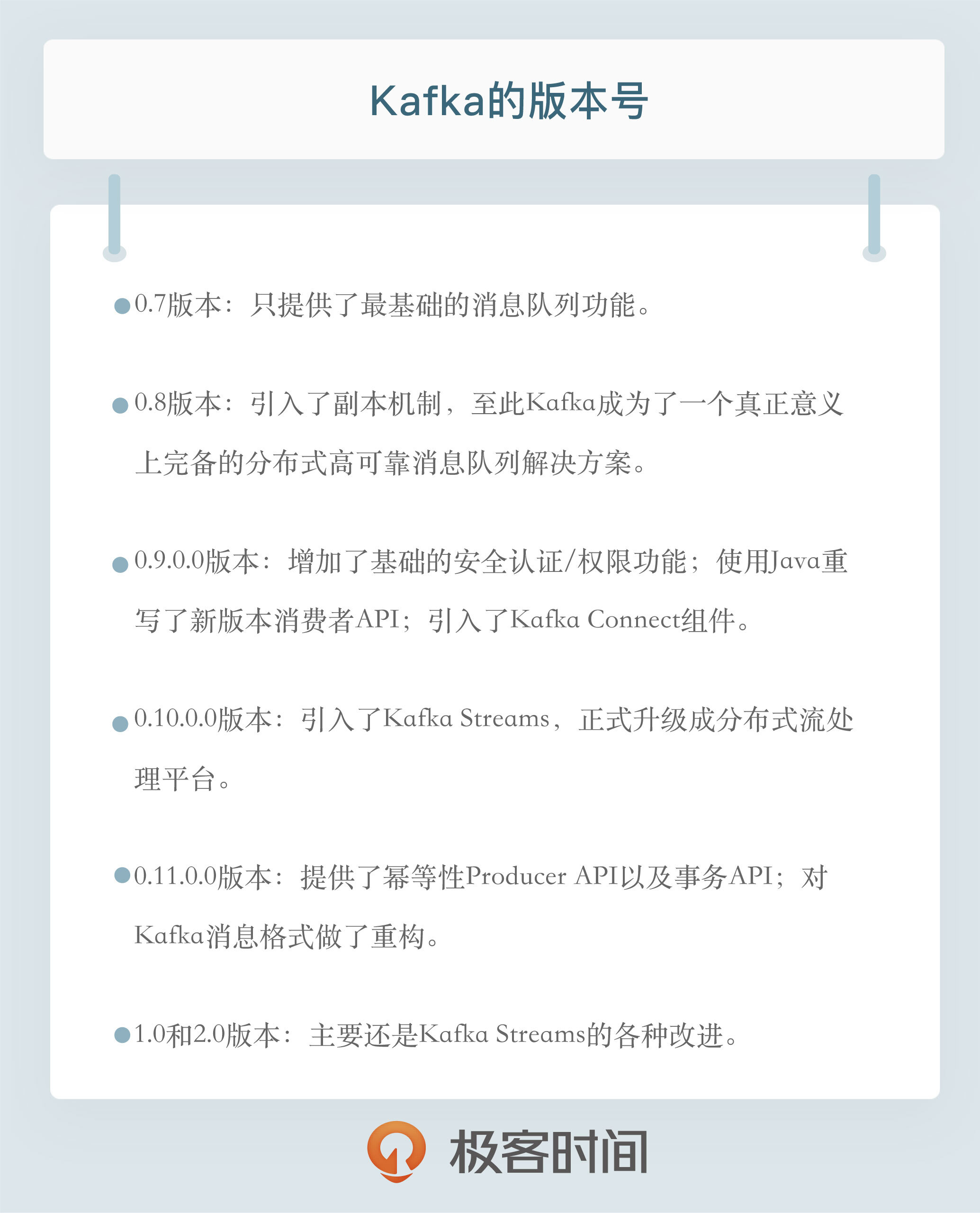 Kafka目前总共演进了7个大版本,分别是0.7、0.8、0.9、0.10、0.11、1.0和2.0,其中的小版本和Patch版本很多。哪些版本引入了哪些重大的功能改进?关于这个问题,我建议你最好能做到如数家珍,因为这样不仅令你在和别人交谈Kafka时显得很酷,而且如果你要向架构师转型或者已然是架构师,那么这些都是能够帮助你进行技术选型、架构评估的重要依据。