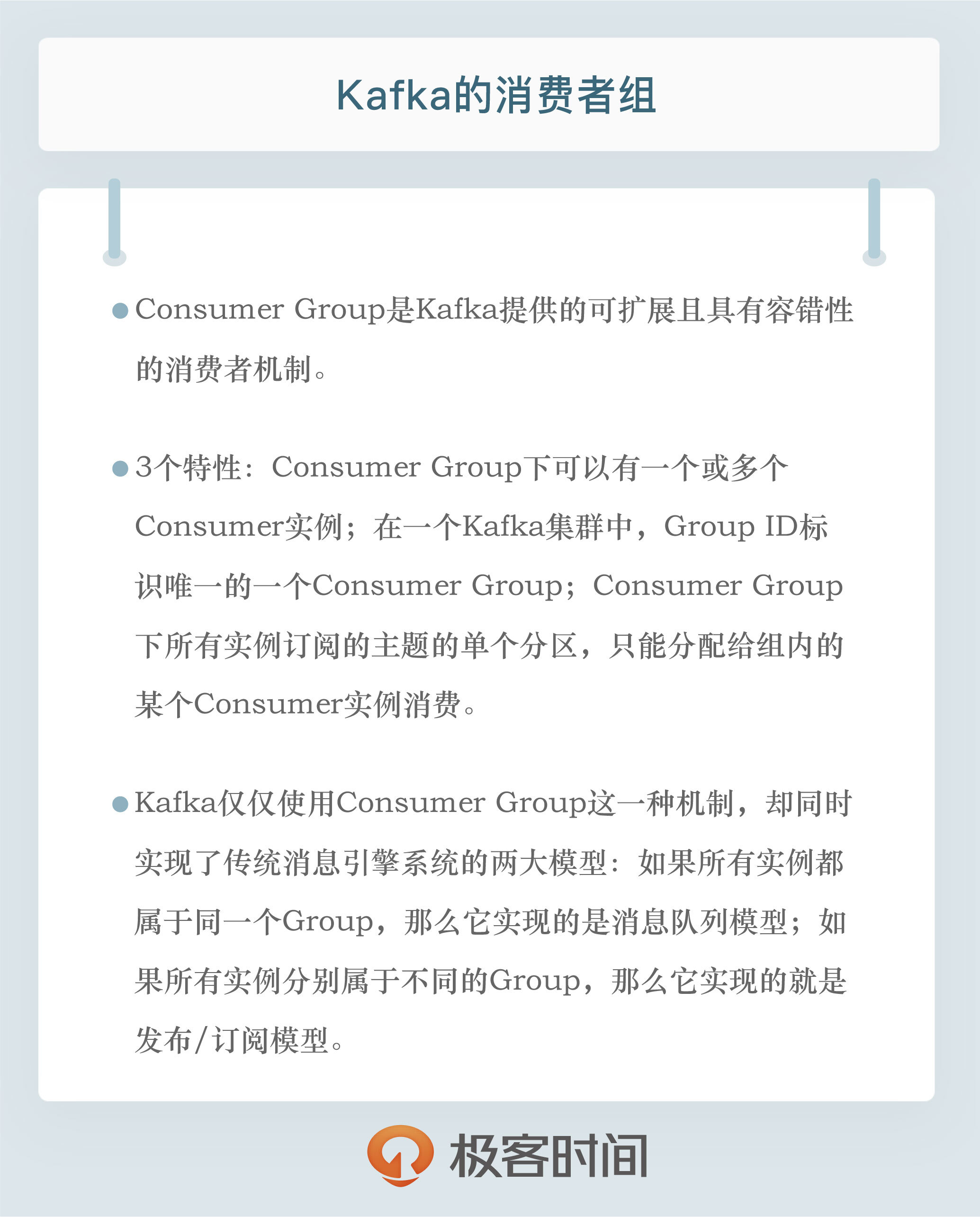 如果有这么一种机制,既可以避开这两种模型的缺陷,又兼具它们的优点,那就太好了。幸运的是,Kafka的Consumer Group就是这样的机制。当Consumer Group订阅了多个主题后,组内的每个实例不要求一定要订阅主题的所有分区,它只会消费部分分区中的消息。