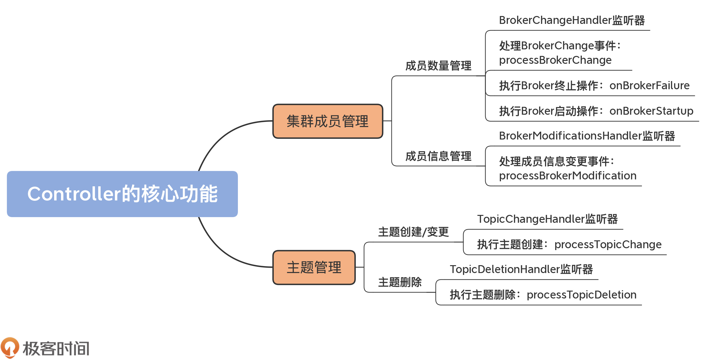 当然,作为核心组件,Controller提供的功能非常多。除了集群成员管理,主题管理也是一个极其重要的功能。今天,我就带你深入了解下它们的实现代码。可以说,这是Controller最核心的两个功能,它们几乎涉及到了集群元数据中的所有重要数据。掌握了这些,之后你在探索Controller的其他代码时,会更加游刃有余。