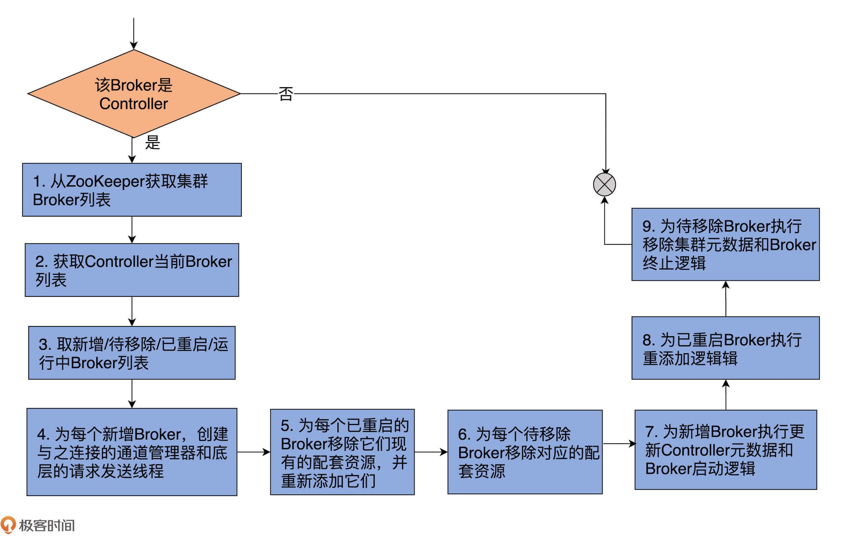 前两步分别是从ZooKeeper和ControllerContext中获取Broker列表;第3步是获取4个Broker列表:新增Broker列表、待移除Broker列表、已重启的Broker列表和当前运行中的Broker列表。