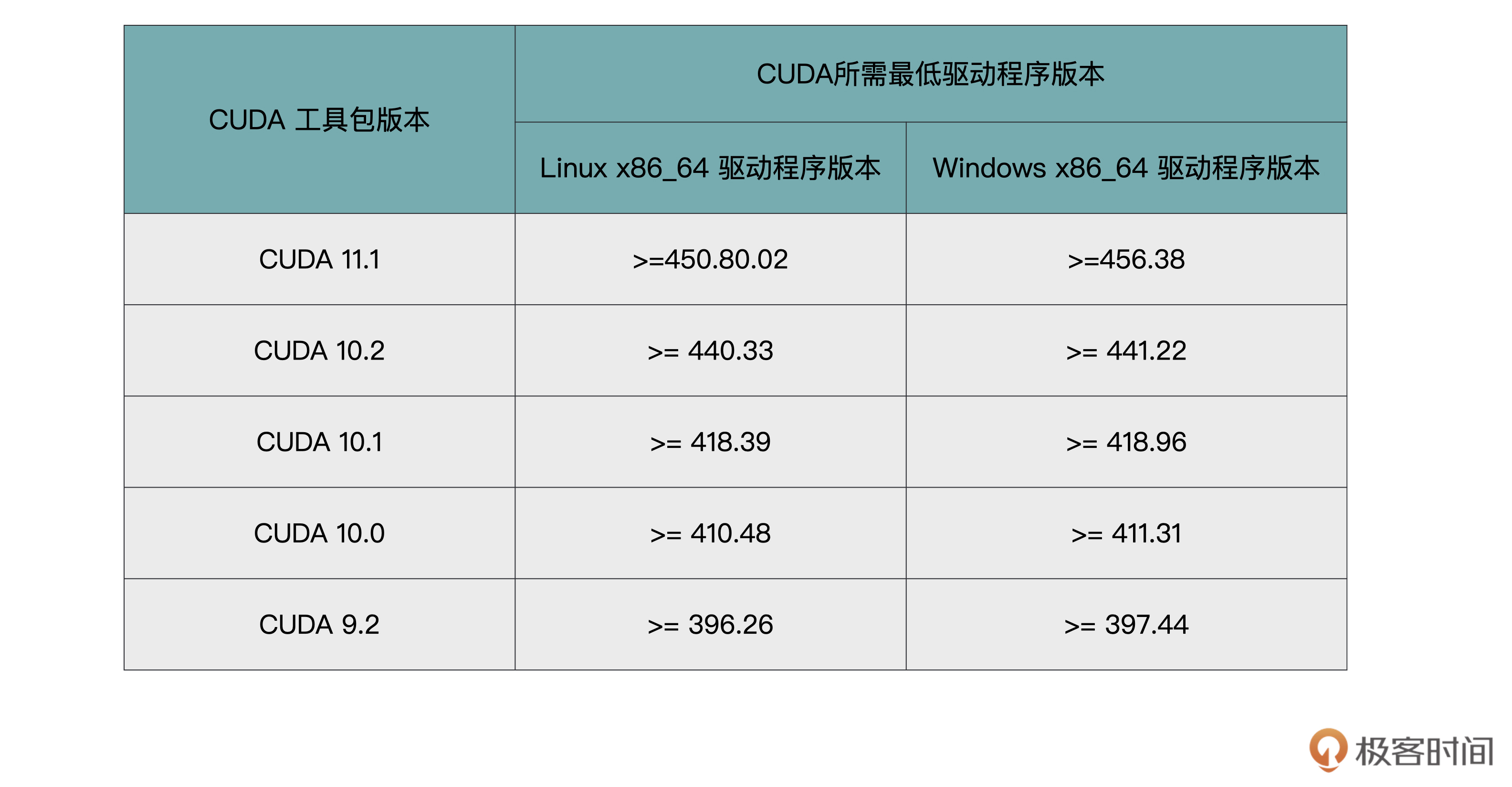 我用表格的方式,帮你梳理了CUDA版本与GPU驱动版本的对应关系,你可以根据自己计算机驱动的情况对照查看。例如,CUDA 11.1支持的 Linux驱动程序是450.80.02以上。-