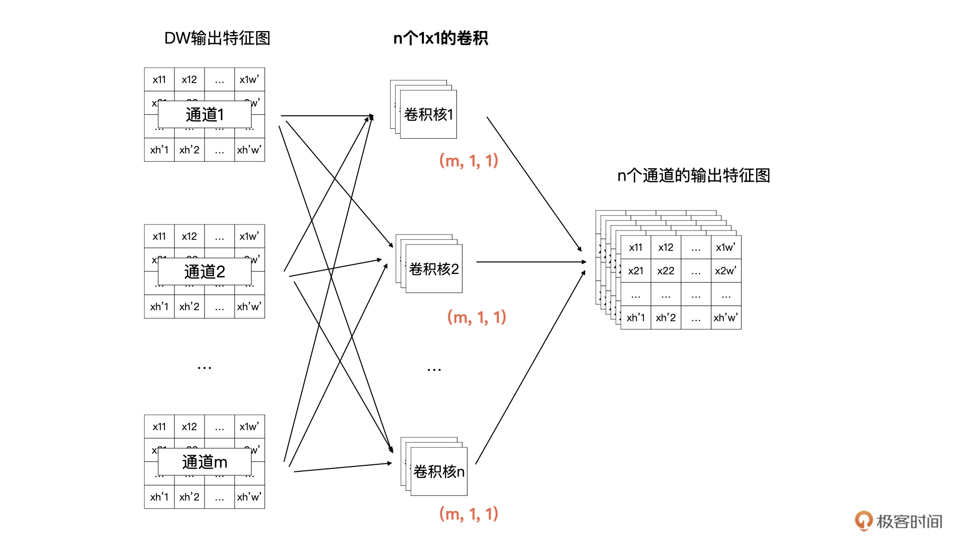 所以,在DW之后我们还要加一个PW卷积。PW 卷积也叫做逐点卷积。PW卷积的主要作用就是将DW输出的m个特征图结合在一起考虑,再输出一个具有n个通道的特征图。