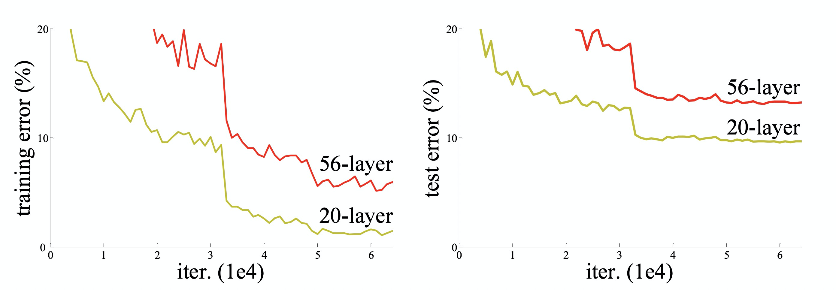 为了验证刚才的观点,作者做了这样的一个实验。通过搭建一个普通的20层卷积神经网络与一个56层的卷积神经网络,在CIFAR-10数据集上进行了验证。无论训练集误差还是测试集误差,56层的网络均高于20层的网络。下图来源于论文。