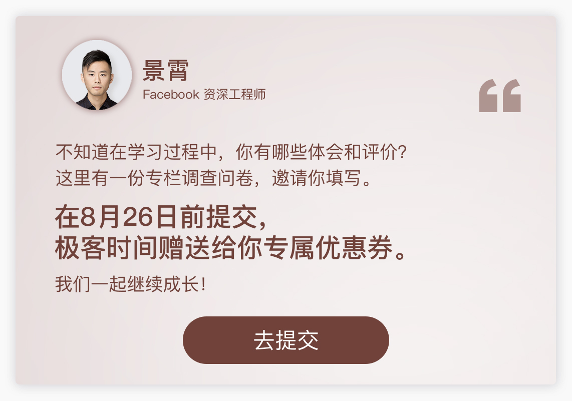 结束不是终点,而是更高阶旅程的重新启航。最后的最后,我们专栏的编辑同学,特意为你准备了一份毕业调查问卷,希望你能抽出两三分钟时间,写下你的学习经历和感受。这既是你课程学习的仪式感,作为你这几个月学习的记录和总结;也是我后续为你优化课程的重要参考资料,很有价值。感谢你的反馈,学习不停,精进不止!