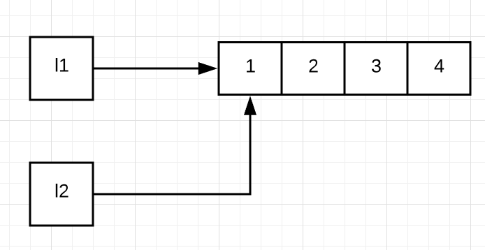 同样的,我们首先让列表l1和l2同时指向了[1, 2, 3]这个对象。
