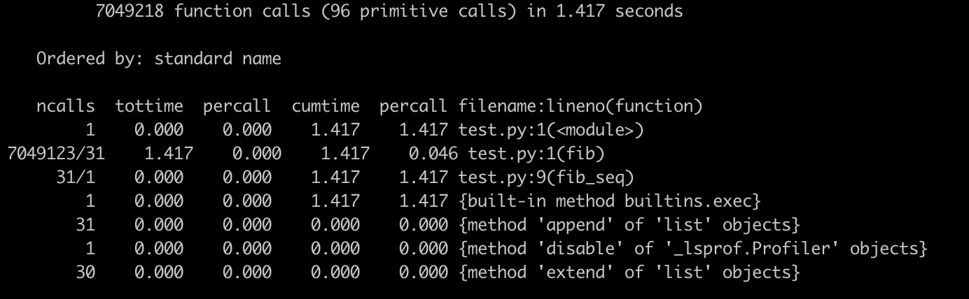 这个简单的例子,便是cProfile的基本用法,也是我今天想讲的重点。当然,cProfile还有很多其他功能,还可以结合stats类来使用,你可以阅读相应的 官方文档 来了解。