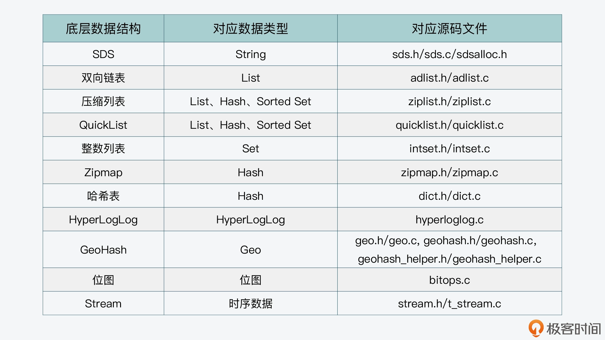 不过,因为 Redis 实现的底层数据结构非常多,所以这里我把这些底层结构和它们对应的键值对类型,以及相应的代码文件列在了下表中,你可以用这张表来快速定位代码文件。