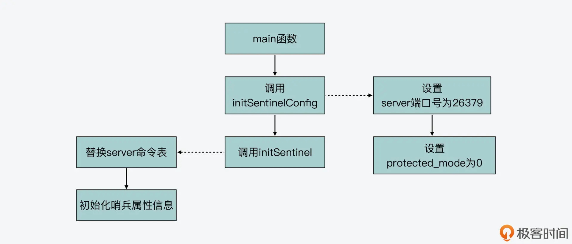 因为哨兵实例是属于运行在一种特殊模式下的 Redis server,而我在【第 8 讲】中,已经给你介绍过了 Redis server 启动后的入口函数 main 的整体执行过程。其实,这个过程就包含了哨兵实例的初始化操作。